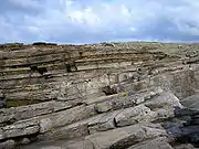 Most of the Old Red Sandstone of Orkney is of Middle Devonian age.[2] The lower part of the sequence, mostly Eifelian in age, is dominated by lacustrine beds of the lower and upper Stromness Flagstones that were deposited in Lake Orcadie. The two flagstones sequences are divided by the Sandwick fish bed, equivalent to the Achanarras formation of Caithness, representing an unusually persistent, deep and widespread lake that filled much of the Orcadian Basin. The sequence continues with the Rousay flagstones deposited in a similar lacustrine environment. The flagstones show a marked cyclicity in their sedimentation, with 86 such cycles being counted for the whole sequence.[4] These are interpreted as representing regular climatically driven changes in lake level caused by Milankovitch cyclicity