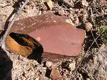 Narrabundah Ashstone is a member of the Canberra formation[12] and is found is eastern Narrabundah and in a geological monument along Fairbairn avenue. Ashstone is a fine grained tuff.[13] In addition to the ashstone the Canberra Formation has layers of green-grey to reddish dacite, also tuff, quartz andesite, but mostly it is calcareous shale, limestone or sandstone. Much is deeply weathered, which has posed difficulties for building foundations.