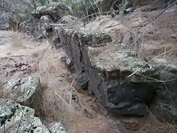 The Laidlaw volcanics are a rhydacitic ignimbrite in the form of pale to dark grey rhyodacitic to dacitic crystal tuff. They are the top layer of Volcanics in the ACT. The Laidlaw Volcanics occur in a band along the Murrumbidgee River to the south west of Canberra, and also north west of Belconnen. They exist in the suburbs of Latham, Chapman, Kambah, and Greenway. The volcanics are of Ludlovian age 420.7±2.2 m.y. and have been used to set an absolute date for the Ludlow epoch. They are up to 850 metres thick.[22]