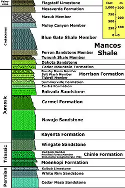 Approximately 94 to 85 million years ago, the seaway advanced onto and retreated from land as it laid down the Mancos Shale.[17] The Mancos is composed mostly of shale but two of its members, the Ferron and Muley Canyon, are sandstone that were laid down when relative sea level temporarily dropped. The five Mancos members from oldest to youngest are: