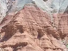 - an upper cliff-forming 120 to 130 foot (37 to 40 m) thick unit of reddish-orange siltstone.