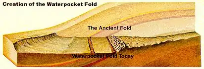 The Laramide orogeny compacted the region from about 70 million to 50 million years ago and in the process created the Rocky Mountains. Many monoclines (a type of gentle upward fold in rock strata) were also formed by the deep compressive forces of the Laramide. One of those monoclines, called the Waterpocket Fold, is the major geographic feature of the park. The 100 mile (160 km) long fold has a north–south alignment with a steeply east-dipping side. The rock layers on the west side of the Waterpocket Fold have been lifted more than 7,000 feet (2,100 m) higher than the layers on the east.[23] Thus older rocks are exposed on the western part of the fold and younger rocks on the eastern part. This particular fold may have been created due to movement along a fault in the Precambrian basement rocks hidden well below any exposed formations. Small earthquakes centered below the fold in 1979 may be from such a fault.[24]
