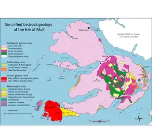 The geology of the Isle of Mull in Scotland is dominated by the development during the early Palaeogene period of a ‘volcanic central complex’ associated with the opening of the Atlantic Ocean. The bedrock of the larger part of the island is formed by basalt lava flows ascribed to the Mull Lava Group erupted onto a succession of Mesozoic sedimentary rocks during the Palaeocene epoch.[1] Precambrian and Palaeozoic rocks occur at the island's margins. A number of distinct deposits and features such as raised beaches were formed during the Quaternary period.