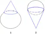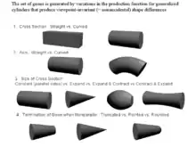 The geons constitute a partition of the set of generalized cones,[2] which are the volumes created when a cross section is swept along an axis. For example, a circle swept along a straight axis would define a cylinder (see Figure). A rectangle swept along a straight axis would define a "brick" (see Figure). Four dimensions with contrastive values (i.e., mutually exclusive values) define the current set of geons (see Figure):