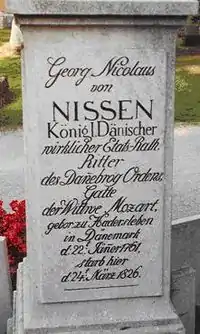 Nissen died, aged 62, in Salzburg, and was buried there. His tombstone, naming him "The husband of Mozart's widow", can still be visited.