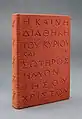 Among the books in the George Baer Collection of Bookbinding (Rare Book Collection, Louis Round Wilson Special Collections Library, University of North Carolina at Chapel Hill) are four books that Baer bound during his years in Greece. These bindings nicely illustrate Baer's attempt to match the decorations with the books' contents. In Franz Spunda's Der Heilige Berg Athos (The holy Mount Athos is located in northeastern Greece) Baer chose to decorate the cover with Greek letters, most of them used just as decorations. But in the center of the cross, the letters ΙΣ ΧΣ (short hand for Jesus Christ) and NIKA (victorious or victory) are ones that frequently appear in Greek Orthodox Iconography. They symbolize that Christ is victorious. In Spyridon Loverdos's book Ho mētropolitēs Smyrnēs Chrysostomos, which describes the life and death of Chrysostomos, the Greek Orthodox bishop of Smyrna during the Turkish Greek War in 1922, Baer decorated the cover with the Double-Headed Eagle, which is of Byzantine origin and was the flag of the Holy Roman Empire from 1400-1800. The small Greek orthodox bible New Testament of our Lord and Saviour Jesus Christ, which measures just 5"x3" is bound in red Moroccan Goat leather. It is decorated with the title in classic Greek letters, thus serving as both the book title as well as its decoration. The final book from the Greek period is Vierzig Jahre auf dem Wasser (Forty years on the Water) by Otto Protzen. It is an account of Protzen's boating experiences with paddle as well as sail boats, mostly in northern Germany but also across the Atlantic to the Massachusetts coast. The figure on the blue leather binding is a Greek galley (a trireme), which seems out of place for a German book dealing with modern sailing in the North Sea. However, Baer had fallen in love with Greece, and followed his whims.