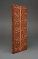 Each year, the Cuneo Press, where George Baer led the fine binding department, requested the production of about 100 Christmas Books to give to their valued customers. Most of these were half leather, but Baer chose to make one, Christmas over the Centuries in full leather for use in exhibitions. This is an example from the early 1960s. The stylized Greek letters, alpha and omega, suggest the beginning and the end. Also note the shepherd's staff on the spine.
