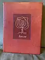 Through Baer’s earlier work in restoring ancient Aramaic letters for Ludwig Borchardt, an Egyptologist in Cairo, he made contact with Prof. Keith Seele[9] at the Chicago Oriental Institute who helped him find a position in the fine binding department of the Cuneo Press. Fine binding was a flourishing art at the time in Chicago with such binders as Leonard Mounteney, Alfred de Sauty, Harold Tribolet, Elisabeth Knerr, George Baer[10] and later William Anthony all active. Among these George Baer was particularly noted for his “bold and imaginative covers, with sensitive use of color”.[10] Baer worked at the Cuneo Press fine binding department from 1950 to 1971, as well as in his own workshop binding books for private clients and restoring books for libraries, especially the University of Minnesota Rare Book room.