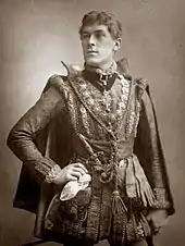 With Irving, Alexander visited the US twice, during the decade, in American tours (1884–1885 and 1887–1888). In Irving's company he progressed in a series of important supporting roles, such as Shakespeare's Orsino, Laertes, Bassanio and Macduff.[1][11] In January 1886, having originally been cast as Valentin in W. G. Wills's Faust, he was promoted to the title role opposite Irving's Mephistopheles.[12] Alexander played the part for 384 performances.[1]