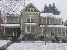 The house is two-story, four-square Late Victorian farmhouse. Although the architect of the Crossman House is unknown, it resembles the type of house that was available through mail-order catalogues in the late 19th century.[18] The house exhibits the characteristics of both the Queen Anne and Folk Victorian styles, including the asymmetrical plan, dominant front-facing gable and use of patterned wood shingles (now asphalt), weatherboards, and projecting bays. The house sits on a fieldstone foundation and has a cross-gable roof. It features an original wraparound front porch with turned posts and balusters.[19]