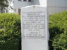 Colonel George Davenport, born George William King (1783 – July 4, 1845), was a 19th-century English-American sailor, frontiersman, fur trader, merchant, postmaster, US Army soldier, Indian agent, and city planner. A prominent and well-known settler in the Iowa Territory, he was one of the earliest settlers in Rock Island. He spent much of his life involved in the early settlement of the Mississippi Valley and the "Quad Cities". The present-day city of Davenport, Iowa, is named after him.[1]