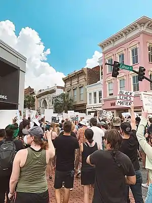 The city issued a curfew after protests resulted in vandalism of public property and statues and some protesters threw rocks at police and citizens. Additionally, several businesses and restaurants had glass windows busted. Two men wearing MAGA hats were assaulted. At one point, police in riot gear used tear gas to stall protesters. Protesters halted traffic on Interstate-26.[5] The following day, a group of 200 protesters formed in Marion Square.[6] One protester, identified as Gee Jordan, was arrested in Marion Square after praising police officers, having stated "I love each and every one of you. [...] I am not your enemy. You are not my enemy."[7][8] He was charged with "disobeying lawful order" and has since been released from jail on bond.[7][8] Charleston Police Chief Luther Reynolds defended the arrest, stating that "We specifically asked for [the protesters], numerous times, to disperse. We said if you don't, you will be arrested".[8][9]