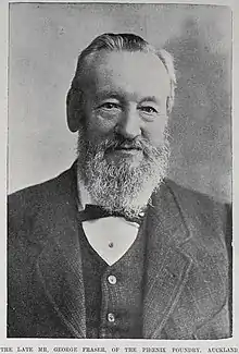 In 1861 George bought a foundry in Parnell and in 1864 moved it further up Grafton Gully as the Phoenix Foundry, initially as Fraser and Tinne and later as George Fraser & Sons Ltd.[2][3][4][5][6] George's restoration of the wrecked ship Triumph was well publicised and awarded around 1884.[5]