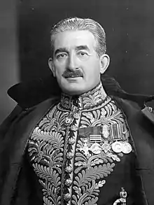 Hennessy, a Franco-Irish aristocrat, served in the First World War as a Major in the King's Royal Rifle Corps and on the Staff of the 8th Division. In 1918 he was elected to parliament for Winchester, a seat he held until 1931, and served under Bonar Law and Baldwin as a Junior Lord of the Treasury from 1922 to 1924 and from 1924 to 1925, as Vice-Chamberlain of the Household from 1925 to 1928 and as Treasurer of the Household from 1928 to 1929. Hennessy held the latter position also from September to November 1931 in the National Government of Ramsay MacDonald. From 1931 to 1941 he was Vice-Chairman of the Conservative and Unionist Party. Hennessy was created a Baronet, of Windlesham in the County of Surrey, in 1927,[1] and on 22 February 1937 he was raised to the peerage as Baron Windlesham, of Windlesham in Surrey.[2]