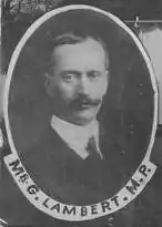 He was first elected as Liberal MP for South Molton at a by-election in 1891. He was Civil Lord of the Admiralty, 1905–1915, "a post for which he had no obvious qualifications. 'A farmer sent to sea' was a jibe frequently heard in those days" (The Times).[4] He lost his seat at the 1924 General Election to the Conservative Cedric Drewe, but regained it at the 1929 general election. Although he began his parliamentary career as a Liberal, in 1931 Lambert had become a National Liberal supporting the Conservative Party, following a long period criticising David Lloyd George and opposition to the Labour Party.