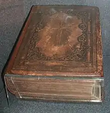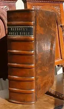 George's brother, Thomas, was the Bible's publisher. Production began in 1811 and was completed in 1814, in a large, folio edition.[5] As were many editions of the Bible at the time, Haydock's was published and sold by subscription, a few leaves at a time. Subscribers would accumulate the sets of leaves over the years and ultimately have the completed Bible bound. Different copies have general title pages dated 1811, 1812, 1813 or 1823,[6] showing variously Thomas Haydock's Manchester or Dublin locations. English Catholics enthusiastically welcomed this impressive volume that symbolized a reinvigorated Catholicism on the verge of winning its long fight to repeal the Penal Laws. At least 1,500 copies of the first edition were sold.