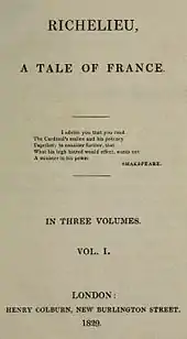 - Richelieu: A Tale of France (3 volumes, 1829)