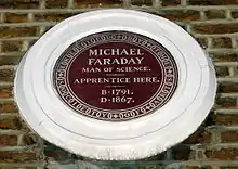 It was Riebau who arranged, through one of his customers, for to be given tickets to hear Humphry Davy lecture on Chemistry at the Royal Institution;[2] Faraday took notes which he later showed to Davy and which led to his joining the RI, the start of his distinguished scientific career.