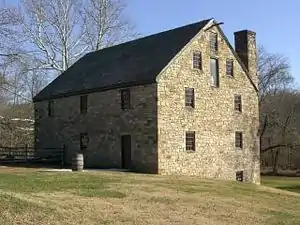 The gristmill is a Colonial Revival-style stone building that was constructed in 1933 based on archaeological and documentary evidence. Its rectangular footprint measures 37 feet (11 m) by 50 feet (15 m). Its foundation is built into a hillside, with two and one half stories above ground on the north side and three and one half stories on the south side. It is a masonry structure built with sandstone arranged in a random pattern with stone lintels and sills. The mill's roof is covered with wooden shingles. On the south side of the building is a vertical-board door on the first floor; there is an identical door on the ground floor on the north side as well. Both have stone landings. The millrace enters the mill on the north side and exits at ground level on the south side.[4]