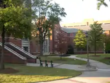 Tech's administrative buildings, such as Tech Tower, and the Bursar's Office, are also located on the Central Campus, in the recently renovated Georgia Tech Historic District.[61][62] The campus library, the Fred B. Wenn Student Center, and the Student Services Building ("Flag Building") are also located on Central Campus. The Student Center provides a variety of recreational and social functions for students including: a computer lab, a game room ("Tech Rec"),[63] the Student Post Office, a music venue, a movie theater, the Food Court, plus meeting rooms for various clubs and organizations. Adjacent to the eastern entrance of the Student Center is the Kessler Campanile (which is referred to by students as "The Shaft").[64] The former Hightower Textile Engineering building was demolished in 2002 to create Yellow Jacket Park. More greenspace now occupies the area around the Kessler Campanile for a more aesthetically pleasing look, in accordance with the official Campus Master Plan.[65] In August 2011, the G. Wayne Clough Undergraduate Learning Commons opened next to the library and occupies part of the Yellow Jacket Park area.[66]