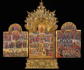 Georgios Klontzas (Greek: Γεώργιος Κλώντζας, 1535-1608) also known as George Klontzas and Zorzi Cloza dito Cristianopullo. He was a scholar, painter, and manuscript illuminator. He is one of the most influential artists of the post-Byzantine period. He defined the Cretan Renaissance. He worked for both Catholic and Orthodox patrons. His artistic output included: icons, miniatures, triptychs, and illuminated manuscripts. He is known for occupying his icons with countless figures. The technique is extremely complex and unique to Klontzas. Andreas Pavias attempted this technique in the Crucifixion of Jesus. Klontzas's painting All Creation rejoices in thee is his most popular work. Klontzas influenced Theodore Poulakis he created an extremely similar painting called In Thee Rejoiceth. Klontzas's work is strongly influenced by the Venetian school. His triptychs strongly resemble the works of Gentile da Fabriano, namely the Intercession Altarpiece. Klontzas's Last Judgement resembles Michelangelo's Last Judgement in the Sistine Chapel. There are very close similarities. There is no indication that Klontzas saw the work but it is a possibility. According to the Institute of Neohellenic Research fifty-four items of his art exist today.[1][2][3][4]