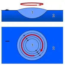 In this case, if we set , we have reverted to the geostrophic equations above. Thus a geostrophic current can be thought of as a rotating shallow water wave with a frequency of zero.