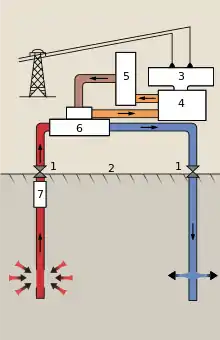 Electricity generation requires high-temperature resources that can only come from deep underground. The heat must be carried to the surface by fluid circulation, either through magma conduits, hot springs, hydrothermal circulation, oil wells, drilled water wells, or a combination of these. This circulation sometimes exists naturally where the crust is thin: magma conduits bring heat close to the surface, and hot springs bring the heat to the surface. If no hot spring is available, a well must be drilled into a hot aquifer. Away from tectonic plate boundaries the geothermal gradient is 25–30 °C per kilometre (km) of depth in most of the world, so wells would have to be several kilometres deep to permit electricity generation.[3] The quantity and quality of recoverable resources improves with drilling depth and proximity to tectonic plate boundaries.