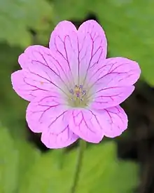 Geranium × oxonianum, the Oxford geranium, is a hybrid variety of flowering plant in the family Geraniaceae, which is a 1932 cross of garden origin between Geranium endressii and Geranium versicolor.[1] Growing to 0.5 m (1.6 ft) tall by 1 m (3.3 ft), it is a highly variable plant with round palmate leaves and often veined flowers in various shades of pink. It can be invasive.[2]
