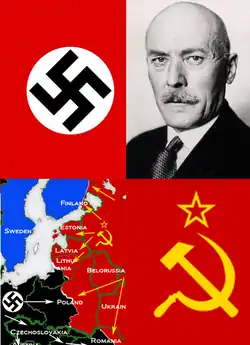 On August 19, 1939, the Soviet Union and Germany entered German–Soviet Commercial Agreement (1939) providing for the trade of certain German military and civilian equipment in exchange for Soviet raw materials.[2][3] On August 23, they entered the Molotov–Ribbentrop Pact, which contained secret protocols dividing the states of Northern and Eastern Europe into German and Soviet "spheres of influence."[4]