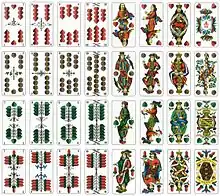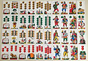 German-suited packs originally had four court cards per suit (King, Queen, Ober and Unter), but the Queen was dropped in the early 16th century. The ten was often depicted with a banner and known as the Banner or Panier; this survives in Swiss-suited cards, but died out in Germany in the mid-16th century, although it continued to be called by the name Panier until at least 1783.[3] The Aces had been dropped even earlier, probably by the 1470s, leaving the standard German pack with 48 cards; the Deuce being promoted into the gap left by the Ace. During the 18th century, the 48-card pack was further reduced to 36, although there is evidence of 48-card, so-called 'Karniffel' packs being sold until the first half of the 19th century in places.[4]