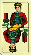 The Württemberg pattern was invented around 1865 by C.L. Wüst and bears many unique features.[19] The kings were copied from French-suited patterns now found in the Netherlands and Portugal. The Obers were inspired by the Knights in Adler Cego decks used in nearby Baden. Unters are journeymen in broad-brimmed hats.[20] Unlike other German-suited patterns, the cards were only ever produced in double-headed format. A younger type of the Württemberg pattern, manufactured by the Nuremberg Playing Card Company (NSV) and others using different court designs, also exists.[21]
