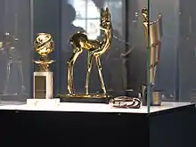 In the first years the awards had numerous trophies that were handed out for different categories. Aside from the main categories for Best Picture, Director and Screenplay most others from the inaugural edition have been short lived such as Film that promote democratic values due to the constant change of the awards constitution in the early years.[1] As a rule stated that awards would only be awarded for outstanding achievements, not every category had a winner each year. Over time, the award in the shape of a film tape became the most common trophy, either in gold or silver. The Golden Bowl became the highest honour for Best Picture, however due to not being handed out for more than 17 years, the award was abolished in 1996.