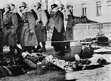 At about 07:50 on the southern outskirts of Haderslev, a Danish 37 mm anti-tank gun with a crew of five attacked the approaching armour.[19] Two German tanks lined up adjacent to one another and opened fire. The Danes landed all three of their shots—one in a tank's tracks—but two of the gun crew were killed and the rest wounded. One tank then drove over the gun. Around the curve on Sønderbro Street, two 20 mm cannon and a machine gun put up resistance at the wagon roadblock on Sønderbro Street. The Germans laid down heavy fire. A Danish soldier was killed and two were wounded, but the Germans were effectively pinned down.[20] The fighting continued for ten minutes until the order to surrender was received from Copenhagen by telephone. The Germans were then allowed to proceed into Haderslev, but the Danish garrison stationed there had not received the order to surrender and fired on them. Two German tanks and a motorcycle proceeded unsuspecting towards the barracks, which were defended by the anti-tank unit from Lundtoftbjerg.[14] They opened fire, killing the motorcyclist and blowing the tracks off one tank, sending it crashing into a house. However, the Danish garrison capitulated at 08:15 when the order to surrender finally came through.[14] One Danish soldier was killed while defending the barracks,[14] and three civilians were killed in the crossfire.[21]