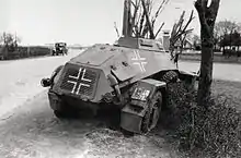 In an encounter between Danish and German forces at Bredevad, 10 km (6 miles) north of the border, a German vanguard of four armoured cars approached the village. The Danes arrived at 6:30 AM and, without time to build a roadblock, took cover in a garden.[18] A machine gun and a 20 mm cannon, manned by one and a half platoons, fired warning shots. When the Germans ignored this, the Danes opened fire from 300 meters (yards) out, knocking out the lead armoured car and killing its driver. A short skirmish followed. The Danes knocked out three more German armoured cars and suffered four casualties. At 07:15 a reinforcing German motorized column arrived from Tinglev, cutting off the Danes and forcing them to surrender. Two Danes were killed and five were wounded.[14]
