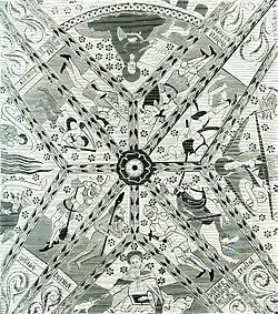 One of the earliest attestations of the heroic tradition is on the Anglo-Saxon Franks Casket (c. 700), which depicts a scene from the legend of Wayland the smith: Wayland is portrayed after having been crippled by king Niðhad. He stands over a headless figure representing Niðhad's children whom he has killed in revenge. The first woman represents Niðhad's daughter bringing a piece of jewelry to be repaired: the figures of the second woman and the man catching birds are unexplained.[60] The top of the Franks Casket also appears to show an archer who is generally identified with Egil, Wayland's brother, and Egil's spouse Ölrún,[61] who appear in the Þiðrekssaga, the Völundarkviða; they are also usually identified on the Pforzen buckle inscription, from c. 570–600.[62]