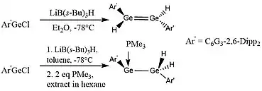 The synthesis and isolation of two digermanium germanium(II) hydrides have also been reported.[3] One of these compounds was formed by the addition of L-selectride to a bulky germanium(II) chloride in ether, while the other was formed by the addition of L-selectride to the same germanium(II) chloride in toluene, followed by filtration and the dropwise addition of PMe3.