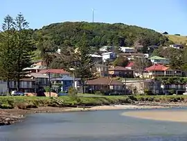 Nearby is Seven Mile Beach National Park, a well regarded area for bird watching, walking and fishing. Hang gliding, paragliding, sailing, windsurfing,[3] and surfing are also enjoyed here.[4] Black Head is suited to rock fishing, though it may be dangerous in high seas. A golf course is situated just north of the town. The rainforest remnants on the hill above the town and behind the beach contain interesting sub-tropical species, such as Snow-wood, Illawarra Plum and Camphorwood.[5][6] The original vegetation was littoral (seaside) rainforest. Possums, wombats and falcons as well as many other indigenous animals may be seen near the town. Whales are commonly spotted in winter months heading north.