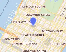 The Gershwin Theatre is on the second floor of Paramount Plaza, also known as 1633 Broadway, north of Times Square in the Midtown Manhattan neighborhood of New York City.[1] Ralph Alswang designed the theater, which opened in 1972 as the Uris Theatre,[2][3] while Emery Roth and Sons designed Paramount Plaza.[4] It is one of two theaters in Paramount Plaza; the other is the Circle in the Square Theatre in the building's basement.[5][6] The Gershwin, Circle in the Square, Minskoff, and American Place theaters were all constructed under the Special Theater District amendment of 1967 as a way to give their respective developers additional floor area.[7]
