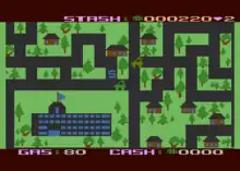 The more money being carried—displayed as "CASH" below the scrolling maze—the more aggressive the three different police vehicles are. If the player is caught, any cash is lost as well as one of the player's three cars. Cash is locked-in by dropping it off at the hideout, where it becomes part of the permanent stash (shown at the top of the screen) and causes the police to lose interest.[6] This can be done at any time. As the game progresses, police begin setting up roadblocks and stop signs. Hitting a roadblock (a dark yellow “X”) puts a hole in the gas tank, causing it to drain quickly until stopping at a gas station. Running a stop sign (an octagon which blinks on and off) causes all of the cash being carried to be lost.