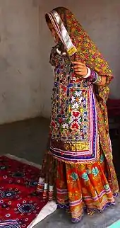 Ghagra choli, (also known as lehenga choli and locally as chaniya choli), is a type of ethnic clothing for women from Indian Subcontinent, notably in the Indian states of Rajasthan,[1][2] Gujarat,[3] Madhya Pradesh, Uttar Pradesh, Bihar, Haryana, Punjab, Himachal Pradesh, Uttarakhand, Jammu and Kashmir, as well as in the Pakistani provinces of Punjab and Sindh. In Punjab, the lehenga is traditionally worn with a kurti.[4][5] It is a combination of the gagra or lehenga (long skirt) and the choli (blouse), however in contemporary and modern usage lehenga choli is the more popular and widely accepted term by fashion designers, trend setters, and boutiques in South Asia, since ghagra is synonymous with the half-slip worn as an undergarment below the sari.