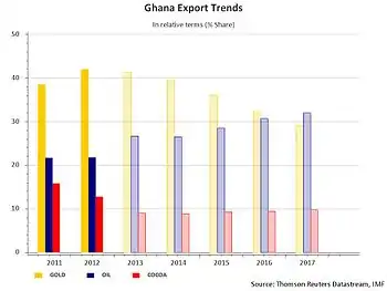 Climate change in Ghana is impacting the people in Ghana in several ways as the country sits at the intersection of three hydro-climatic zones.[73] Changes in rainfall, weather conditions and sea-level rise will affect the salinity of coastal waters. This is expected to negatively affect both farming and fisheries.[74] The national economy stands to suffer from the impacts of climate change because of its dependence on climate sensitive-sectors such as agriculture, energy, and forestry. Moreover, access to freshwater is expected to become more challenging and reduced water supply will have a negative impact on hydropower, which provides 54% of the country's electricity capacity.[74] Additionally, Ghana will likely see more cases of malaria and cholera, since both are impacted by changes in water conditions.