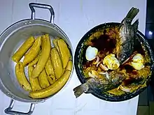 - Ampesie—boiled yam. It may also be made with plantain, cocoyam, potatoes, yams or cassava. This side dish is traditionally eaten with fish stew containing tomatoes, oil and spices.