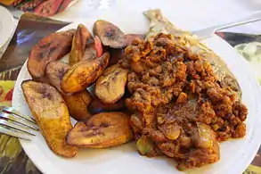 Fried sweet foods include cubed and spiced ripe plantain (kelewele) sometimes served with peanuts. Koose made from peeled beans (and its close twin acarajé or akara made from beans which are not peeled), maasa,[10][11] pinkaaso,[12] and bofrot/Puff-puff[13] (made from wheat flour); waakye [14] dzowey and nkate cake (made from peanuts);[15] kaklo and tatale[16] (ripe plantain fritters); kube cake and kube toffee (made from coconut); bankye krakro, gari biscuit,[17][18] and krakye ayuosu (made from cassava); condensed milk, toffee, plantain chips (or fried plantain)[19] and wagashi[20] (fried farmer's cheese) are fried Ghanaian savory foods (confectionery).