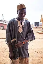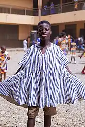 A Ghanaian smock is a plaid shirt that is similar to the dashiki, worn by both women and men in Ghana.[1] It is the most popular traditional attire in Ghana. The smock is called Bingmaa in Dagbani language, Bun-nwↃ or Bana by Mamprusis, fugu in Mosi, batakari in the southern regions, dansika in Frafra, and Banaa in Kusaal both in the upper east region.[2] It is worn by Royals and civilians across Dagbon and other northern regions, but popular across Ghana. The smock originated in the northern region of Ghana but widely used in West Africa and diasporans across the world. The smock is not unlike the national attire of Burkina Faso known as faso dan fadi.