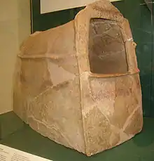The Ghassulian stage was characterized by small hamlet settlements of mixed farming peoples, who had immigrated from the north and settled in the southern Levant - today's Jordan, Israel and Palestine.[3] People of the Beersheba culture (a Ghassulian subculture) lived in underground dwellings, a unique phenomenon in the archaeological history of the region, or in trapezoidal houses of mud-brick. Those were often built partially underground (on top of collapsed underground dwellings) and were covered with remarkable polychrome wall paintings.[3][6] Their pottery was highly elaborate, including footed bowls and horn-shaped drinking goblets,[3] indicating the cultivation of wine. Several samples display the use of sculptural decoration or of a reserved slip (a clay and water coating partially wiped away while still wet).[3] The Ghassulians were a Chalcolithic culture as they used stone tools but also smelted copper.[3][6] Funerary customs show evidence that they buried their dead in stone dolmens [7] and also practiced secondary burial.[6]