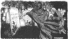 Unlike the two previous Spirits who come at the stroke of one, the Ghost of Christmas Yet to Come makes its appearance on the last stroke of twelve, the Witching Hour.[9] It is introduced as an ominous and silent figure, "...a solemn Phantom, draped and hooded, coming, like a mist along the ground, towards him... Scrooge feared the silent shape so much that his legs trembled beneath him, and he found that he could hardly stand when he prepared to follow it."