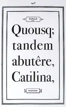Bodoni achieved an unprecedented level of technical refinement, allowing him to faithfully reproduce letterforms with very thin "hairlines", standing in sharp contrast to the thicker lines constituting the main stems of the characters. He became known for his designs of pseudoclassical typefaces and highly styled editions some considered more apt "to be admired for typeface and layout, not to be studied or read".[2] His printing reflected an aesthetic of plain, unadorned style, combined with purity of materials.[3] This style attracted many admirers and imitators, surpassing the popularity of French typographers such as Philippe Grandjean and Pierre Simon Fournier. Bodoni has also had his share of detractors, including William Morris, who felt that his almost mechanical perfection seemed cold and inhumane.