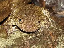 The giant wrinkled frog (Nyctibatrachus karnatakaensis, arguably a junior synonym of N. hussaini)[4] is a species of frogs in the family Nyctibatrachidae endemic to the Western Ghats of India in the Kudremukh region. Its natural habitats are tropical moist lowland forests and rivers. It is threatened by habitat loss.[1]