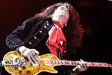 Marc Bolan of T.Rex played a late-50s Les Paul, potentially a stripped Goldtop, later refitted with a Les Paul Custom neck. Gibson recreated this unique guitar in 2011, producing 450 examples including 100 hand-aged, numbered versions and 350 utilising the vintage original spec process.[58] The guitars are notable for the custom-made PAF-reproduction uncovered humbucker pickups. The guitars feature a custom finish, referred to by Gibson as "Bolan chablis".