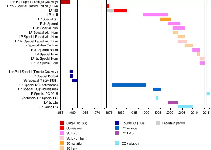 "The Les Paul Special was introduced in 1955 as an intermediate model between the regular Les Paul guitar and the lower-priced Junior and TV instruments. Like the latter, the Special underwent two successive body redesigns in 1958 and 1961 while the Les Paul affiliation was discontinued in late 1959. The model was then renamed SG Special without any apparent changes in the specification other than the removal of Les Paul marking. Overall four variants of the Special can be distinguished between 1955 and 1965.”, “Les Paul Special (1955-1958) ...”, “Les Paul Special (1959) ...”, “SG Special (1959-1961) ...”, “SG Special (1961-...”"